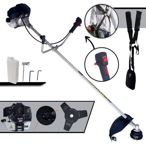 Com guidão ergonômico lateral, permite um alcance amplo e maior mobilidade, capaz de aumentar a produtividade diária. Possui motor 2 tempos á gasolina, de 43 Cilindradas, 10.000 de rotação 1,7HP de potência que proporcionam maior performance e economia na operação. Seu conjunto de acessórios inclui kit de ferramentas, cinto de suporte duplo almofadado, carretel de nylon e lâmina de corte 3 pontas.