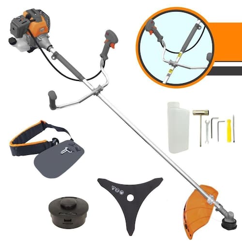 Com guidão ergonômico lateral, permite um alcance amplo e maior mobilidade, capaz de aumentar a produtividade diária. Possui motor 2 tempos á gasolina, de 42,7 Cilindradas (43cc) de rotação 1,7HP de potência que proporcionam maior performance e economia na operação. Seu conjunto de acessórios inclui kit de ferramentas, cinto de sustentação, carretel de nylon e lâmina de corte 3 pontas.