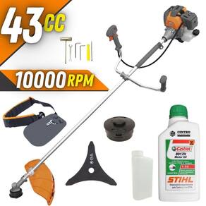 Com guidão ergonômico lateral, permite um alcance amplo e maior mobilidade, capaz de aumentar a produtividade diária. Possui motor 2 tempos á gasolina, de 42,7 Cilindradas (43cc) de rotação 1,7HP de potência que proporcionam maior performance e economia na operação. Seu conjunto de acessórios inclui kit de ferramentas, cinto de sustentação, carretel de nylon e lâmina de corte 3 pontas.