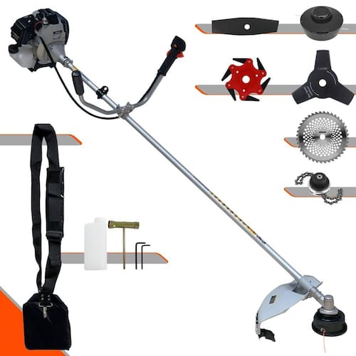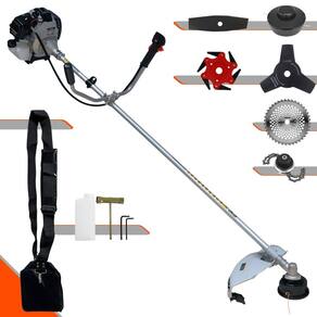 Com guidão ergonômico lateral, permite um alcance amplo e maior mobilidade, capaz de aumentar a produtividade diária. Possui motor 2 tempos á gasolina, de 42,7 Cilindradas, 12.000 de rotação 1,7HP de potência que proporcionam maior performance e economia na operação. Seu conjunto de acessórios inclui kit de ferramentas, cinto de suporte almofadado, carretel de nylon e lâmina de corte 3 pontas.