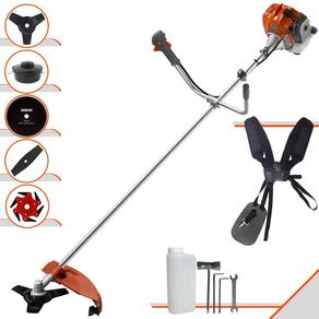Com guidão ergonômico lateral, permite um alcance amplo e maior mobilidade, capaz de aumentar a produtividade diária. Possui motor 2 tempos á gasolina, de 42,7 Cilindradas (43cc) 9.000 de rotação 1,7HP de potência que proporcionam maior performance e economia na operação.Seu conjunto de acessórios inclui kit de ferramentas, cinto de suporte duplo almofadado, carretel de nylon e lâmina de corte 3 pontas.