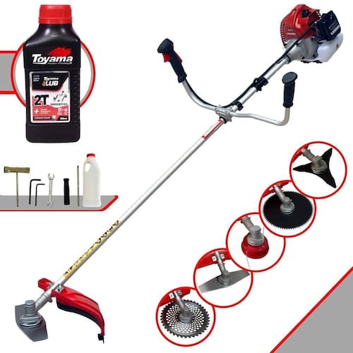 Com guidão ergonômico lateral, permite um alcance amplo e maior mobilidade, capaz de aumentar a produtividade diária. Possui motor 2 tempos á gasolina, de 62 Cilindradas; 3HP de potência que proporcionam maior performance e economia na operação. Seu conjunto de acessórios inclui kit de ferramentas, cinto de suporte almofadado, carretel de nylon e lâmina de corte 3 pontas.