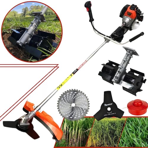 Esta é uma Roçadeira Multifuncional pois considera-se além da finalidade de corte de Grama, Mato, Troncos; você tem em suas mãos uma Maquina de Capinar leve e portatil, ideal para pequenas propriedades rurais.