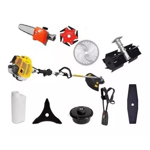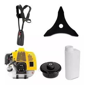 OBS: Recomenda-se que no ato de abastecimento da roçadeira, deve-se colocar gasolina misturada com óleo 2 tempos. Devendo ser 40 ml de óleo 2 tempos para 1 litro de gasolina. Conteúdo da Embalagem: 01 Roçadeira 01 Lâmina 3 Pontas .01 Lamina facão .01 Lamina 6 pontas .01 Lamina serrinha .01 Motopoda . 01 Enxada rotativa 01 Carretel com Fio de Nylon 01 Cinto Duplo com Suporte 01 Frasco Dosador 01 Kit Montagem e Manutenção