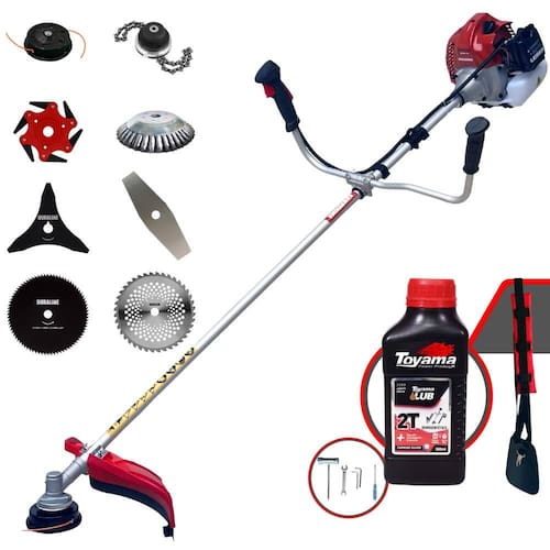 Roçadeira À Gasolina Kawashima BCJ 431L 42,7CC 1,7HP 2T + Faca 3 Pontas + Faca 6 Pontas + Faca 40 Dentes + Faca 80 Dentes + Trimmer + Escova 38 Cerdas + Óleo Toyama FG50 500ml