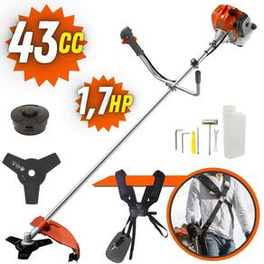 Com guidão ergonômico lateral, permite um alcance amplo e maior mobilidade, capaz de aumentar a produtividade diária. Possui motor 2 tempos á gasolina, de 42,7 Cilindradas (43cc) 9.000 de rotação 1,7HP de potência que proporcionam maior performance e economia na operação. Seu conjunto de acessórios inclui kit de ferramentas, cinto de suporte duplo almofadado, carretel de nylon e lâmina de corte 3 pontas.