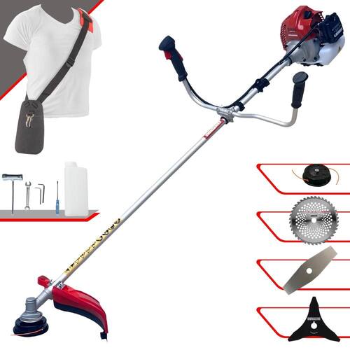 Com guidão ergonômico lateral, permite um alcance amplo e maior mobilidade, capaz de aumentar a produtividade diária. Possui motor 2 tempos á gasolina, de 43 Cilindradas; 1,7HP de potência que proporcionam maior performance e economia na operação. Seu conjunto de acessórios inclui kit de ferramentas, cinto de suporte almofadado, carretel de nylon e lâmina de corte 3 pontas.