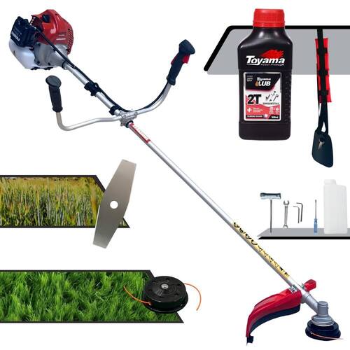 Com guidão ergonômico lateral, permite um alcance amplo e maior mobilidade, capaz de aumentar a produtividade diária. Possui motor 2 tempos á gasolina, de 52 Cilindradas; 2,5HP de potência que proporcionam maior performance e economia na operação. Seu conjunto de acessórios inclui kit de ferramentas, cinto de suporte almofadado, carretel de nylon e lâmina de corte 3 pontas.