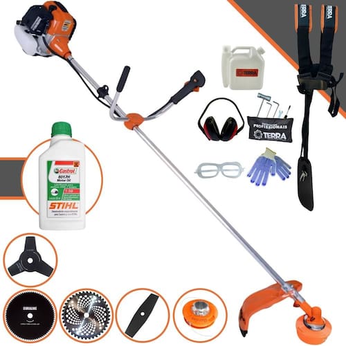 Roçadeira Lateral Terra GR520XP À Gasolina 2 Tempos 52cc 2,5HP Com Lâmina 40 Dentes + Faca 2 Pontas 330mm 2,7mm + Faca 3 Pontas 255mm 2,9mm + Faca 80 Dentes 255mm 1,5mm + Óleo Castrol Stihl 500ml