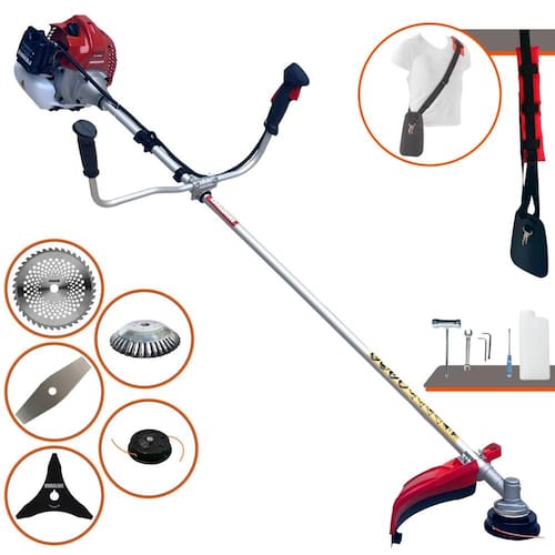 Com guidão ergonômico lateral, permite um alcance amplo e maior mobilidade, capaz de aumentar a produtividade diária. Possui motor 2 tempos á gasolina, de 43 Cilindradas; 1,7HP de potência que proporcionam maior performance e economia na operação. Seu conjunto de acessórios inclui kit de ferramentas, cinto de suporte almofadado, carretel de nylon e lâmina de corte 3 pontas.