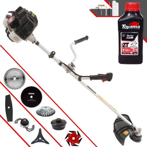 Roçadeira Kawashima KW52-LE À Gasolina 2T 52cc 2,5HP Com Lâmina 3 Pontas + Faca 2 Pontas + Faca 40 Dentes + Faca 80 Dentes + Faca 6 Pontas + Escova Rotativa 38 Cerdas + Trimmer + Óleo TOYAMA LUB FG50 500ml 2T