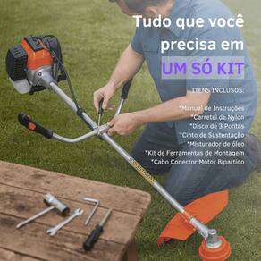 Itens Inclusos: Manual de instruções com vídeo explicativo Carretel de nylon Disco de 3 pontas Cinto de sustentação Misturador de óleo Kit de ferramentas de montagem Cabo de conexão do motor bipartido