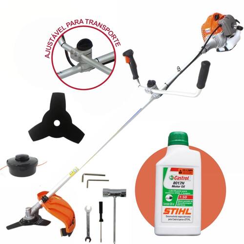 ROÇADEIRA LATERAL A GASOLINA VULCAN TRENT VR430P 2T 43CC 1,7HP COM GUIDAO DE AJUSTE RAPIDO E ACELERADOR COM SISTEMA DE AMORTECIMENTO PARA MAIOR CONFORTO + OLEO LUBRIFICANTE STIHL CASTROL 2T 500ML Marca: Vulcan Trent Modelo: VR430P Motor: 2 tempos Potência: 1,7 HP ( 1,25kw) Cilindrada: 42,7 cc Rotação Máxima: 10.000 RPM Rotação na lenta: 3.000 RPM Eixo Cardã: Eixo Rígido de 8mm com 9 Estrias - Tamanho 153mm (1,53 metros) Tubo do eixo cardã: Tubo de Alumínio 28mm - Tamanho 150mm (1,50 metros ) Lâmina: 3 Pontas - 25 cm - Espessura 2mm - Furo 1" Ignição: Eletrônica - CDI Carretel: Automático Arranque: Manual com mola retrátil Carburador: Tipo membranas Combustível: Gasolina com Óleo 2 tempos na Proporção 25:1 Cinto de sustentação: Duplo ombro a ombro Tanque do Combustível: 900ml Consumo: Aproximadamente 1,1 Litros por hora Autonomia: Aproximadamente 1 hora Guidão: Único Ajustável com giro até 180° com Fixador Ajustável Peso do produto: 8,800kg Dimensões do produto [A x L x P cm]: 26 x 68 x 162 Embalagem caixa única [A x L x P cm] : 21 x 28 x 197 - 11,950kg Embalagens separadas: [A x L x P cm] Motor: 33X32X34 6,800kg Haste: 12X13X168 3,400kg Guidão: 12X27X72 1,300kg Apresentação em embalagens: 1 Caixa Motor, 1 Caixa Guidão e Acessórios + 1 Caixa Haste Itens e acessórios na(s) caixa(s): 1 Lâmina 3 pontas, 1 Carretel, 1 Dosador de Combustível, 1 Cinto de Sustentação, 1 Jogo de Chaves com: (1 Chave combinada, 1 Chave fenda, 2 Chaves Allen), 1 Oleo Lubrificante Stihl Castrol 2T de 500ml.