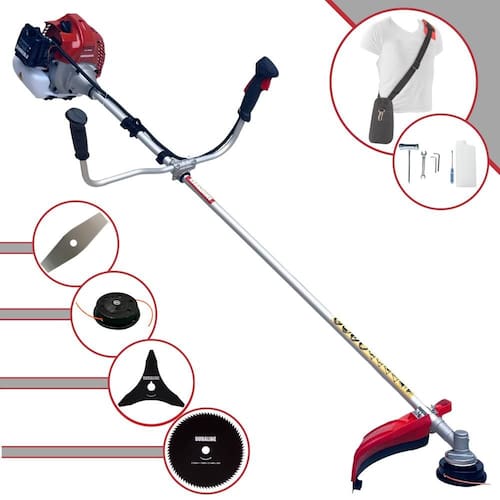 Com guidão ergonômico lateral, permite um alcance amplo e maior mobilidade, capaz de aumentar a produtividade diária. Possui motor 2 tempos á gasolina, de 52 Cilindradas; 2,5HP de potência que proporcionam maior performance e economia na operação. Seu conjunto de acessórios inclui kit de ferramentas, cinto de suporte almofadado, carretel de nylon e lâmina de corte 3 pontas.