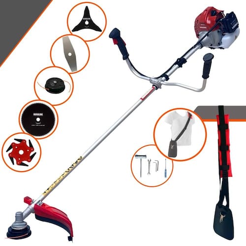 Com guidão ergonômico lateral, permite um alcance amplo e maior mobilidade, capaz de aumentar a produtividade diária. Possui motor 2 tempos á gasolina, de 52 Cilindradas; 2,5HP de potência que proporcionam maior performance e economia na operação. Seu conjunto de acessórios inclui kit de ferramentas, cinto de suporte almofadado, carretel de nylon e lâmina de corte 3 pontas.