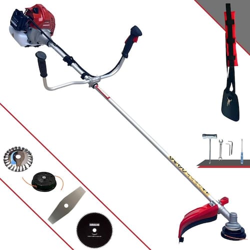 Com guidão ergonômico lateral, permite um alcance amplo e maior mobilidade, capaz de aumentar a produtividade diária. Possui motor 2 tempos á gasolina, de 52 Cilindradas; 2,5HP de potência que proporcionam maior performance e economia na operação. Seu conjunto de acessórios inclui kit de ferramentas, cinto de suporte almofadado, carretel de nylon e lâmina de corte 3 pontas.