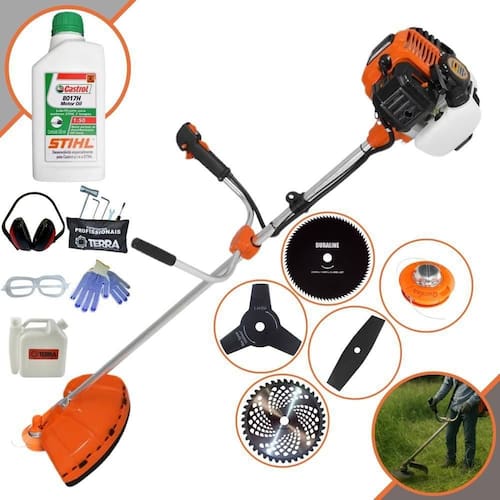 Roçadeira Profissional Lateral Terra GR520XP À Gasolina 2 Tempos 52cc 2,5HP Com Lâmina 40 Dentes + Faca 2 Pontas 330mm 2,7mm + Faca 3 Pontas 255mm 2,9mm + Faca 80 Dentes 255mm 1,5mm + Óleo Castrol Stihl 500ml