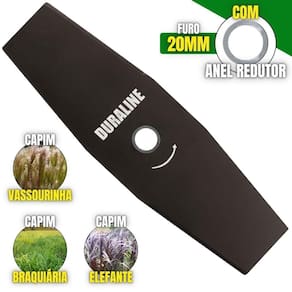 A LÂMINA (FACÃO) 2 Pontas acompanha um anel de redução que pode ser utiizada para roçadeiras de furo 20mm ou 25mm, sendo feita em aço cromo vanádio que garante mais segurança, desempenho e durabilidade. É uma lâmina balanceada, fazendo com que haja menor vibração, corte contínuo e suave, com mais conforto ao operador e mais longevidade para a roçadeira. Possui maior rendimento no trabalho e não precisa ser afiada antes do. É uma lâmina Multi de 2 pontas que pode ser aplicada para diferentes trabalhos, possui material reforçado que é ideal para trabalhos pesados, podendo cortar os seguintes capins: Capim Grosso, Capim Elefante, Guanxuma, Annoni, Vassourinha, Capim Napier, Capim Sapê e entre outras variantes de capins.