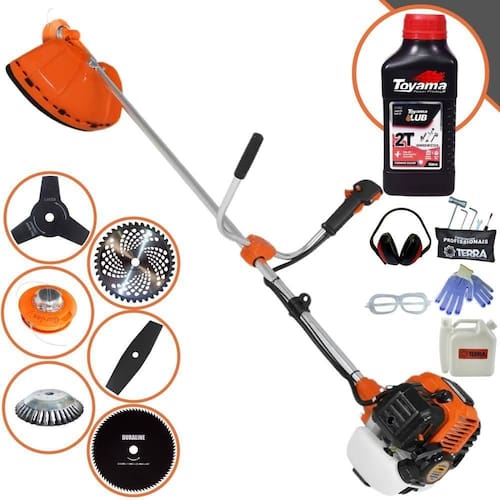 Roçadeira Profissional Lateral Terra GR520XP À Gasolina 2 Tempos 52cc 2,5HP Com Lâmina 40 Dentes + Faca 2 Pontas 330mm + Faca 3 Pontas 255mm + Faca 80 Dentes 255mm + Escova Rotativa 38 Cerdas + Óleo TOYAMA LUB FG50 500ml 2T
