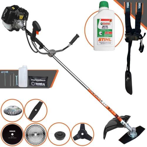Roçadeira Profissional Lateral Terra GRH-520 Black À Gasolina 2 Tempos 52cc 2,5HP + Faca 3 Pontas 255mm 2,9mm + Faca 40 Pontas 255mm 2mm + Faca 80 Pontas 255mm 1,5mm + Escova Rotativa 200mm 38 Cerdas + Óleo Castrol Stihl 500ml