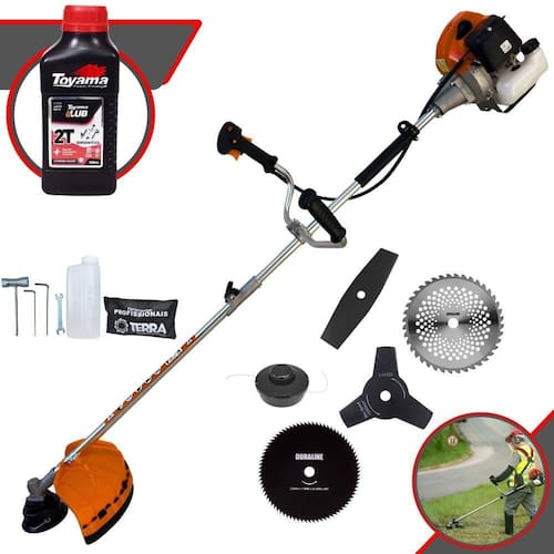 Roçadeira Profissional Lateral Terra GRHB-430 Bipartida À Gasolina 2 Tempos 43cc 1,7HP + Faca 3 Pontas + Faca 40 Pontas + Faca 80 Pontas + Óleo TOYAMA LUB FG50 500ml 2T