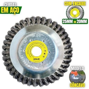 A Escova rotativa da Duraline acompanha um anel de redução, ou seja, pode ser utilizada para roçadeiras de furo 20mm ou 25mm, tendo as cerdas feitas em aço garante mais segurança, desempenho e durabilidade. A Escova Rotativa Duraline é balanceada, fazendo com que haja menor vibração, corte contínuo e suave, com mais conforto ao operador e mais longevidade para a roçadeira. A escova é do modelo côncavo, assim facilitando o seu uso durante o manuseio. A Escova pode ser aplicada para diferentes trabalhos, dentre elas: Limpeza de Pavers, Limpeza de Calçadas, Limpeza de concreto, Limpeza de Pavimentos, Remoção de musgos e Remoção de ervas daninhas