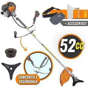 Com guidão ergonômico lateral, permite um alcance amplo e maior mobilidade, capaz de aumentar a produtividade diária. Possui motor 2 tempos á gasolina, de 51,6 Cilindradas (52cc) 10.000 de rotação 2,0 HP de potência que proporcionam maior performance e economia na operação. Seu conjunto de acessórios inclui kit de ferramentas, cinto de sustentação, carretel de nylon e lâmina de corte 3 pontas.