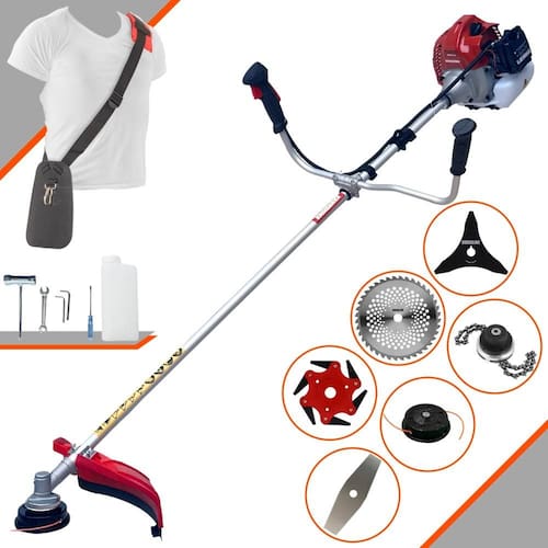 Com guidão ergonômico lateral, permite um alcance amplo e maior mobilidade, capaz de aumentar a produtividade diária. Possui motor 2 tempos á gasolina, de 43 Cilindradas; 1,7HP de potência que proporcionam maior performance e economia na operação. Seu conjunto de acessórios inclui kit de ferramentas, cinto de suporte almofadado, carretel de nylon e lâmina de corte 3 pontas.
