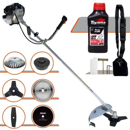 Roçadeira Profissional À Gasolina Toyama TBC43H 42,7cc 1,7HP 12.000rpm 2T + Faca 2 Pontas 330mm 2,7mm + Faca 40 Dentes 255mm 2mm + Faca 80 Dentes 255mm 1,5mm + Escova Rotativa 38 Cerdas 200mm + Óleo Toyama FG50 500ml