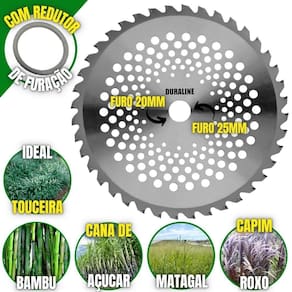 O DISCO DE CORTE 40 Dentes de Vídea acompanha um anel de redução, ou seja, pode ser utiizada para roçadeiras de furo 20mm ou 25mm além de possui pintura feita por Cataforese a qual é mais resistente à corrosão. Seus dentes de vídea soldados à laser possuem encaixe especial, garantindo mais segurança, desempenho e durabilidade, as lâminas são balanceadas com menor vibração, corte contínuo e suave, com mais conforto ao operador e mais longevidade para a roçadeira. Possui maior rendimento no trabalho e não precisa ser afiada antes do uso, uma vez que possuem ponta 4 lados de polímero, solda de ponta tipo U. Ideal para terrenos com cascalhos e pequenos galhos para serrar.