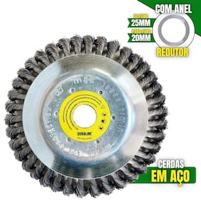 A Escova rotativa da Duraline acompanha um anel de redução, ou seja, pode ser utilizada para roçadeiras de furo 20mm ou 25mm, tendo as cerdas feitas em aço garante mais segurança, desempenho e durabilidade. A Escova Rotativa Duraline é balanceada, fazendo com que haja menor vibração, corte contínuo e suave, com mais conforto ao operador e mais longevidade para a roçadeira. A escova é do modelo côncavo, assim facilitando o seu uso durante o manuseio. A Escova pode ser aplicada para diferentes trabalhos, dentre elas: Limpeza de Pavers, Limpeza de Calçadas, Limpeza de concreto, Limpeza de Pavimentos, Remoção de musgos e Remoção de ervas daninhas