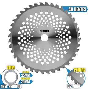 O DISCO DE CORTE 40 Dentes de Vídea acompanha um anel de redução, ou seja, pode ser utiizada para roçadeiras de furo 20mm ou 25mm além de possui pintura feita por Cataforese a qual é mais resistente à corrosão. Seus dentes de vídea soldados à laser possuem encaixe especial, garantindo mais segurança, desempenho e durabilidade, as lâminas são balanceadas com menor vibração, corte contínuo e suave, com mais conforto ao operador e mais longevidade para a roçadeira. Possui maior rendimento no trabalho e não precisa ser afiada antes do uso, uma vez que possuem ponta 4 lados de polímero, solda de ponta tipo U. Ideal para terrenos com cascalhos e pequenos galhos para serrar.