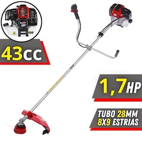 Com guidão ergonômico lateral, permite um alcance amplo e maior mobilidade, capaz de aumentar a produtividade diária. Possui motor 2 tempos á gasolina, de 43 Cilindradas, 10.000 de rotação 1,7HP de potência que proporcionam maior performance e economia na operação. Seu conjunto de acessórios inclui kit de ferramentas, cinto de suporte duplo almofadado, carretel de nylon e lâmina de corte 3 pontas.