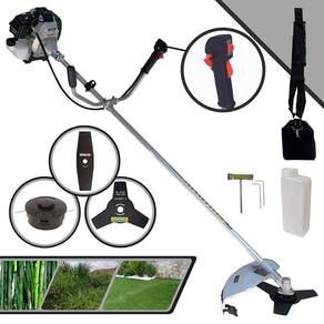Com guidão ergonômico lateral, permite um alcance amplo e maior mobilidade, capaz de aumentar a produtividade diária. Possui motor 2 tempos á gasolina, de 42,7 Cilindradas, 12.000 de rotação 1,7HP de potência que proporcionam maior performance e economia na operação. Seu conjunto de acessórios inclui kit de ferramentas, cinto de suporte almofadado, carretel de nylon e lâmina de corte 3 pontas.