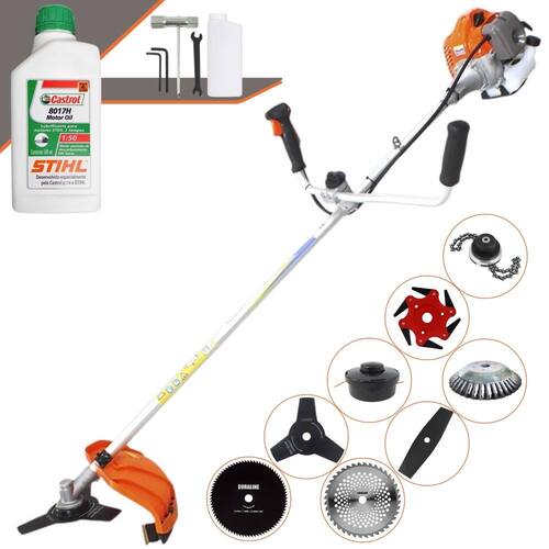 Roçadeira Vulcan Lateral VR430P 2T 43cc 1,7HP À Gasolina Com Faca 3 Pontas + Faca 2 Pontas 330mm + Faca 40 Dentes 255mm + Faca 80 Dentes 255mm + Faca 6 Pontas 250mm + Trimmer + Escova Rotativa 200mm 38 Cerdas + ÓLEO CASTROL STIHL 500ml