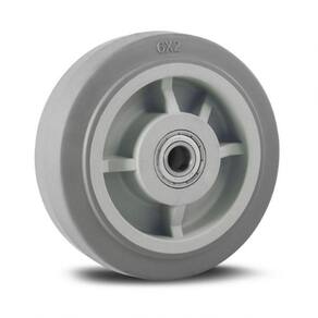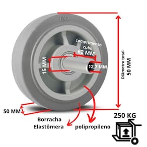 Também conta com facilidade e conforto nas manobras manuais contribuído na redução do esforço físico do operador.Indicada para cargas médias de até 250 kg, respeitando uma margem de segurança de 25%, oferece vantagens no uso de uma mesma roda para diferentes tipos de pisos: macio e duro.Composição da RodaBanda: Borracha elastômero (cinza). Dureza: 90 Shore A (-40C a 50C) Núcleo: De polipropileno de alta resistência, com duplo rolamento de esferas 6202ZZ 15mm e bucha separadora para a redução do eixo para 1/2Especificação técnica: