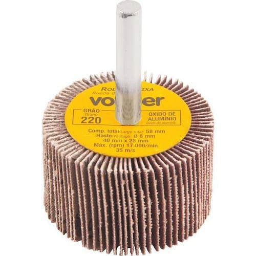 Ref.: do Fornecedor:1271425220Marca:VonderConteúdo da Embalagem:1 Roda de lixa com hasteDestaques e diferenciais:Prática e econômica, oferece acabamento consistente e taxas de corte uniformeAplicações e dicas de uso:Indicada para lixamentos e acabamentos de superfícies planas, contornos e partes internas em aço, ferro, plástico, alumínio, entre outros. Adaptável em lixadeiras para tornos, furadeiras elétricas e chicotes em geral.Características Técnicas:Diâmetro externo da roda de lixa: 40,0 mm Espessura da roda de lixa: 25,0 mm Diâmetro da haste da roda de lixa: 6,0 mm Rotação máxima rpm : 17000 /min Grão: G 220 Tipo de grão abrasivo: Óxido de alumínio Marca: Não Informado