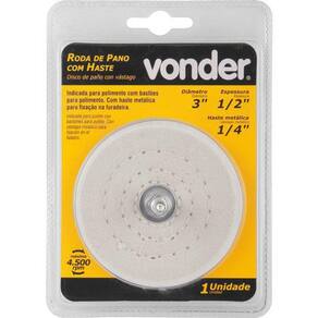 Roda de pano 3 c/haste vonder 3599033000 Conteúdo da embalagem: 1 roda de pano com haste Indicada para polimento com bastões para polimento. Utilizada em furadeiras. Com haste metálica para fixação na furadeira Diâmetro externo da roda com haste: 3 - 76 mm Espessura da roda com haste: 1/2 - 12,7 mm Diâmetro da haste da roda: 1/4 - 6,3 mm Rotação máxima rpm : 4500 /min - e cdc : legal: 90 dias