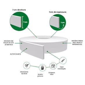 Dimensões AxLxP (cm): 7 X 1 X 500 Produzido em: Borracha E.V.A Cor Acabamento: Branco Garantia: 3 anos junto ao fabricante Aplicação: Externo ou Interno Peso: 0.450 Kg 5 Metros