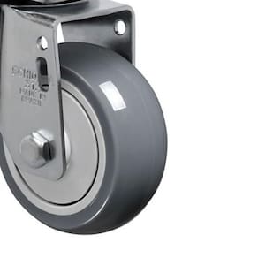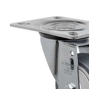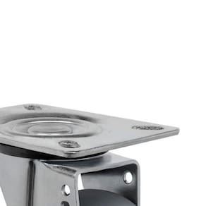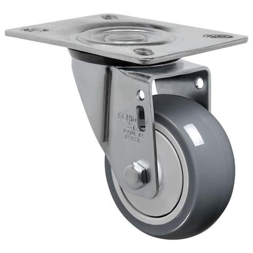 Rodizio giratório fabricado em chapa estampada e cabeçote com uma pista de esferas, acabamento zincado. Eixo da roda rebitado. Roda produzida com revestimento em Composto Termoplástico de PVC reciclado cinza escuro. Dureza: 85 Shore A., e núcleo em polipropileno reciclado. Proporciona rodagem macia e silenciosa, ótima proteção ao piso, excelente resistência química, boa resistência ao desgaste e aos impactos, resultando em ótima relação custo/benefício.