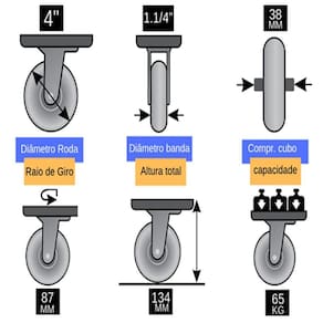 Rodizio giratório 4 polegadas com placa 80x104 com freio em aço e acabamento zincado Furo passante, rodas de borracha termoplástica. Proporciona alta resistência à corrosão, boa mobilidade, baixo ruído, maciez e não marcam o piso. Indicado para as mais diversas aplicações. Características técnicas: Diâmetro da roda (pol): 4 Polegadas 101,6 mm furo passante com freio: não Placa: 80x104mm Largura da banda da roda : 1.1/4" - 31,75 mm Comprimento do cubo (mm): 38 mm Raio de giro do rodízio (mm): 87 mm Eixo ( Parafuso) 5/16 Altura total (mm):134 mm Capacidade de carga (kg): 65 kg Material da Roda: Borracha termoplástica Dureza: 75 shore Temperatura de trabalho: -10 a 50 indicado: concreto liso, cerâmica, aço, metal, madeira, Proteção ao piso, trabalho silencioso, água, contato ocasionado com o vapor, cavacos metálico, óleo industrial, álcool, tração manual.
