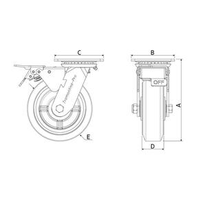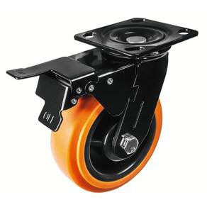 Rodízio articulado para carros organizador inteligente. Corpo em aço carbono na cor preta. Roda de borracha na cor laranja. 150 mm de diâmetro. 50 mm de espessura.Com sistema de freio.