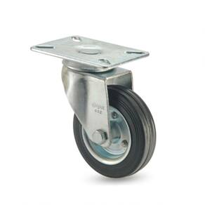 Rodízios giratório com rodas de borracha garfo em aço zincado 3 mm espessura, com rolamento tipo rolete com bucha de aço, placa de aço dupla pista esfera, design inovador, com núcleo em chapa de aço estampado banda de rodagem em borracha maciça indicado para cargas leves e média