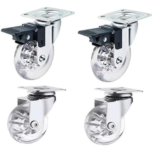 Garfo fabricado em chapa estampada e cabeçote com uma pista de , acabamento cromado. Eixo da roda rebitado, roda 50 mm colorgel, composto termoplástico com pvc transparente. Dureza: 90 shore a 10ºc a +50ºc injetada com revestimento em composto termoplástico com pvc transparente em diversas cores e núcleo em acrílico. Ideal para móveis, gira com muita facilidade, requerendo pouco esforço para movimentação. Não deforma sob carga estática, apresenta boa resistência química e a impactos moderados. Produzida com material reciclável 2 rodizios giratórios e 2 rodizios giratórios com freio fixação placa quadrada 4 furos medidas 42 x 42 mm entre furos 32 x 32 mm altura rodízio 65 mm capacidade carga por rodízio 40 kgs eixo furo passante sem rolamento freio pedal acionamento simples trava somente a roda garantia 3 meses defeito fabricação Marca: Movifacil