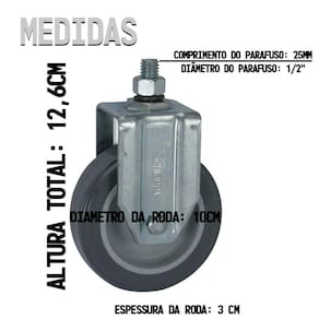 Especificações Técnicas: Diâmetro da Roda: 100 mm Largura da roda: 32 mm Espiga Roscada: 1/2 UNC x 25mm Capacidade: 65 kg Tipo de eixo: 5/16 - Furo Passante