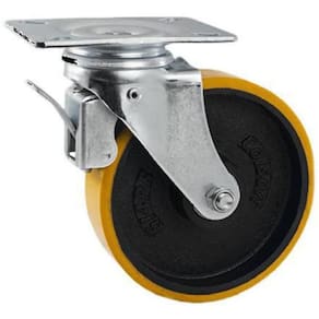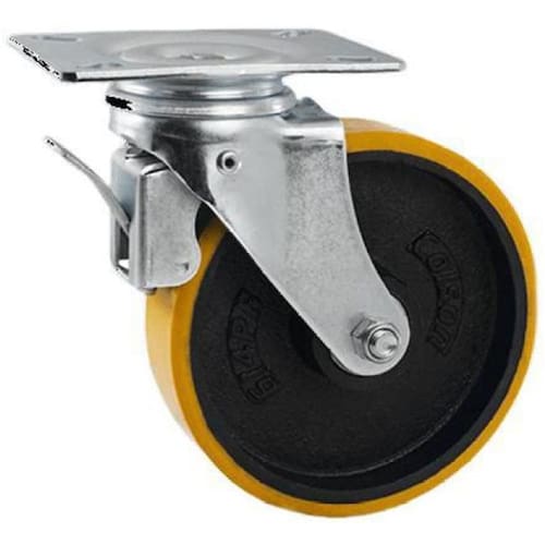 O Rodizio Giratório 4 Polegadas 414 GLPF é um produto nacional, sem freio é indicado para uso industrial, pois, possui resistente a ambientes mais severos, com placa e roda ferro, banda em poliuretano, com capacidade de carga de 300 kg cada roda, indicado para are industrial. Um produto da linha Série 14 Reforçada Uma linha de produtos reforçados com excelente custo-benefício,. Rodízios em aço com dupla pista de rolamentos e acabamento zincado. Garantido alta resistência e performance à corrosão e excelente capacidade de carga para aplicações mais severas que necessitem de boa mobilidade Características técnicas: Diâmetro da roda pol : 4 Placa giratória ; 100 X 127 MM Com freio: sim Largura da banda da roda : 1.1/2 Comprimento do cubo mm : 48 mm Raio de giro do rodízio mm : 94 mm Altura total mm : 134 mm Diâmetro do eixo: 7/16 polegadas Duplo Rolamento Capacidade de carga kg : 300 kg Dureza: 95 shore Material: PU - Poliuretano Temperatura de trabalho: -20º a 70º Cor: Amarelo Indicado: concreto liso, asfalto, cerâmica, aço, metal, madeira, Proteção ao piso, trabalho silencioso, água, contato ocasionado com o vapor, óleo industrial, tração manual. Ean: 7898505231196