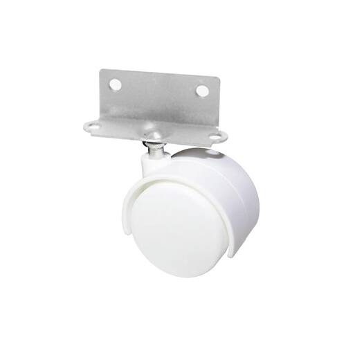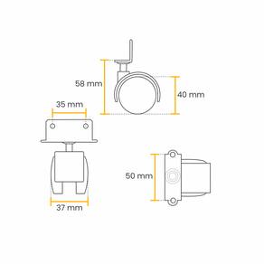 Material: Ferro de alta resistência. Diâmetro da Roda: 50 mm. Altura total (incluindo suporte): 60 mm. Distância entre furos: 35 mm. Comprimento do suporte: 52 mm. Cor: Branco. Fixação: Com suporte para parafusos.