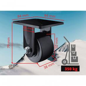 Rodizio giratório dark Strong é o que possui maior capacidade de carga entre os rodízios de 2 polegadas. Rodízio giratório reforçado de nylon preto, com duplo rolamento de esfera na rodas, com rodagem fixa As Rodas resistentes, como o nome sugere, adequadas para o transporte de cargas pesadas, com pintura em epóxi e com capacidade de carga de até 350 kg por roda, adequado para aplicações pesadas, indústria, carrinhos, armário. Características técnicas: Diâmetro da roda: 50 mm Largura da banda da roda : 1.1/2 pol. - 38 mm Raio de giro do rodízio (mm): 40 mm Altura total (mm): 79 mm Rodagem: rolamento de esfera Capacidade de carga (kg): 350 kg Dureza: 95 shore Temperatura de trabalho: -10 a 100 imagens ilustrativa indicado: concreto liso, cerâmica, aço, metal, madeira, Proteção ao piso, trabalho silencioso, água, contato ocasionado com o vapor, cavacos metálico, óleo industrial, álcool, tração manual.