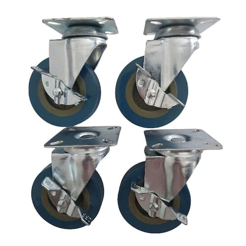 rodizios giratórios com freio pedal acionamento simples trava somente a roda fixação placa quadrada 4 furos medidas 65 x 65 mm entre furos 45 x 45 mm altura rodízio 100 mm capacidade carga por rodízio 60 kgs eixo furo passante sem rolamento roda 3 polegadas diametro 75 mm largura 20 mm garantia 3 meses defeito fabricação Marca: Movifacil