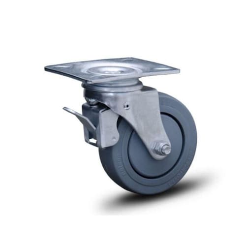 Rodízio Performa Giratório 4 Polegadas Placa Com Freio Suporte com construção reforçada proporciona trabalho silencioso com absorção de vibrações, proteção ao piso e à carga, ainda permite facilidade e conforto em manobras manuais, material exclusivo com alta resistência ao desgaste.Rodízio para carrinhos e dispositivos de movimentação manual em indústrias, comércios, oficinas e centros de distribuição.Roda:: Banda em material termoplástico macio (cinza), núcleo e calotas em polipropileno (Cinza) e rolamento de esferas Dureza 75 Shore A (-40C a 50C).Garfo:Em aço com 3,75mm de espessura, acabamento zincado branco e duplo rolamento de esferas.Capacidade de carga: 110kgModelo: GiratórioDiâmetro: 4 PolegadasLargura da banda da Roda: 1.1/2 PolegadasComprimento do cubo: 48mmTipo de rodagem: esferasRaio de giro do rodízio: 94mmAltura total: 134mmParafuso do eixo: 7/16 Polegadas